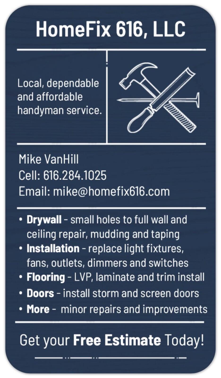 We offer a variety of services to keep your home up to date and in tip-top shape. We strive to build your trust and ensure quality repairs, done on time and at an affordable price. Some of our services include: drywall repairs, lVP and laminate flooring installation, TV wall mount, replacement of light fixtures, ceiling fans, electrical outlets, switches and dimmers, installing storm and screen doors, interior and barn style doors, wall and window trim, shelf installation and more.